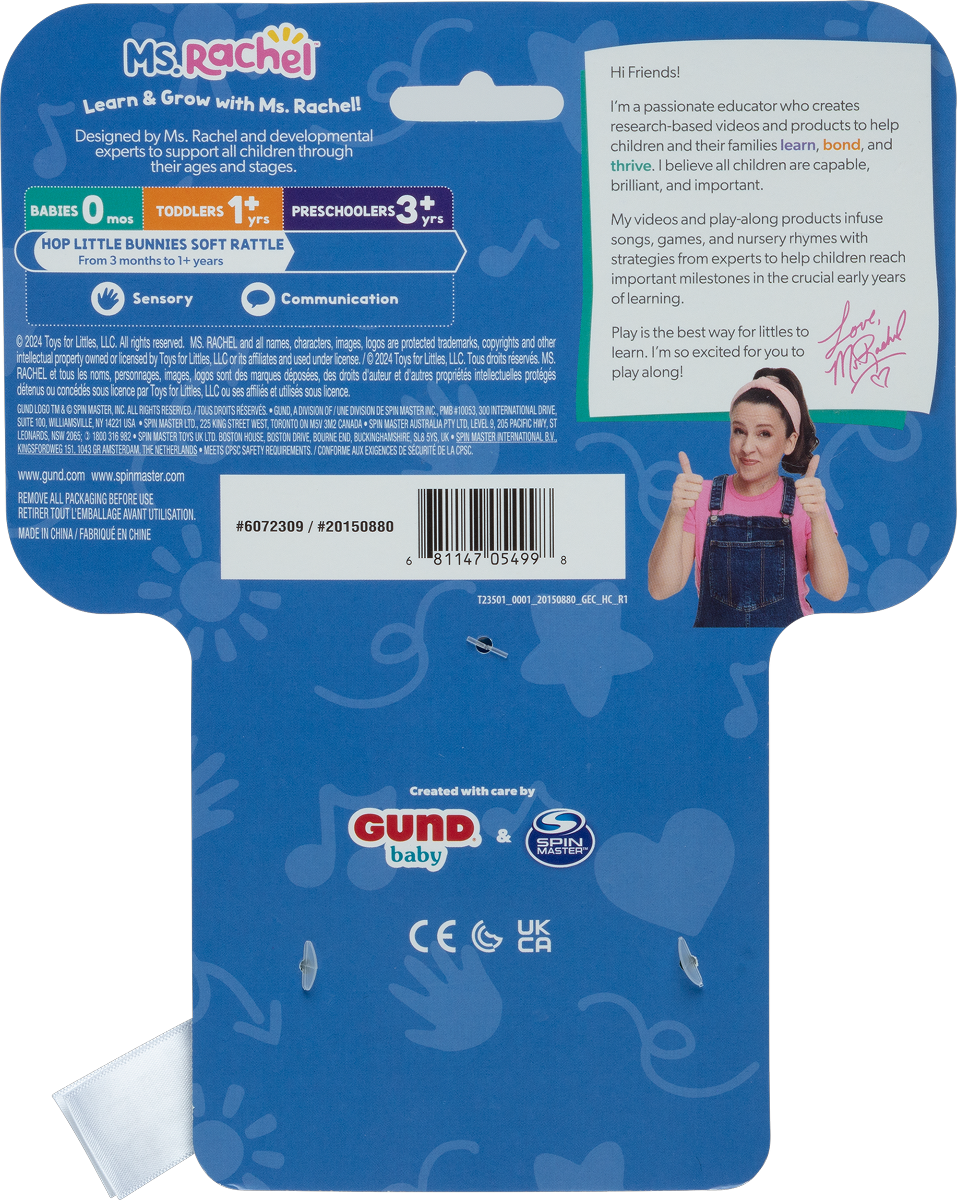 Inspired by the popular “Hop Little Bunnies” song, this soft rattle stimulates baby’s senses with textures, sounds, and colors.