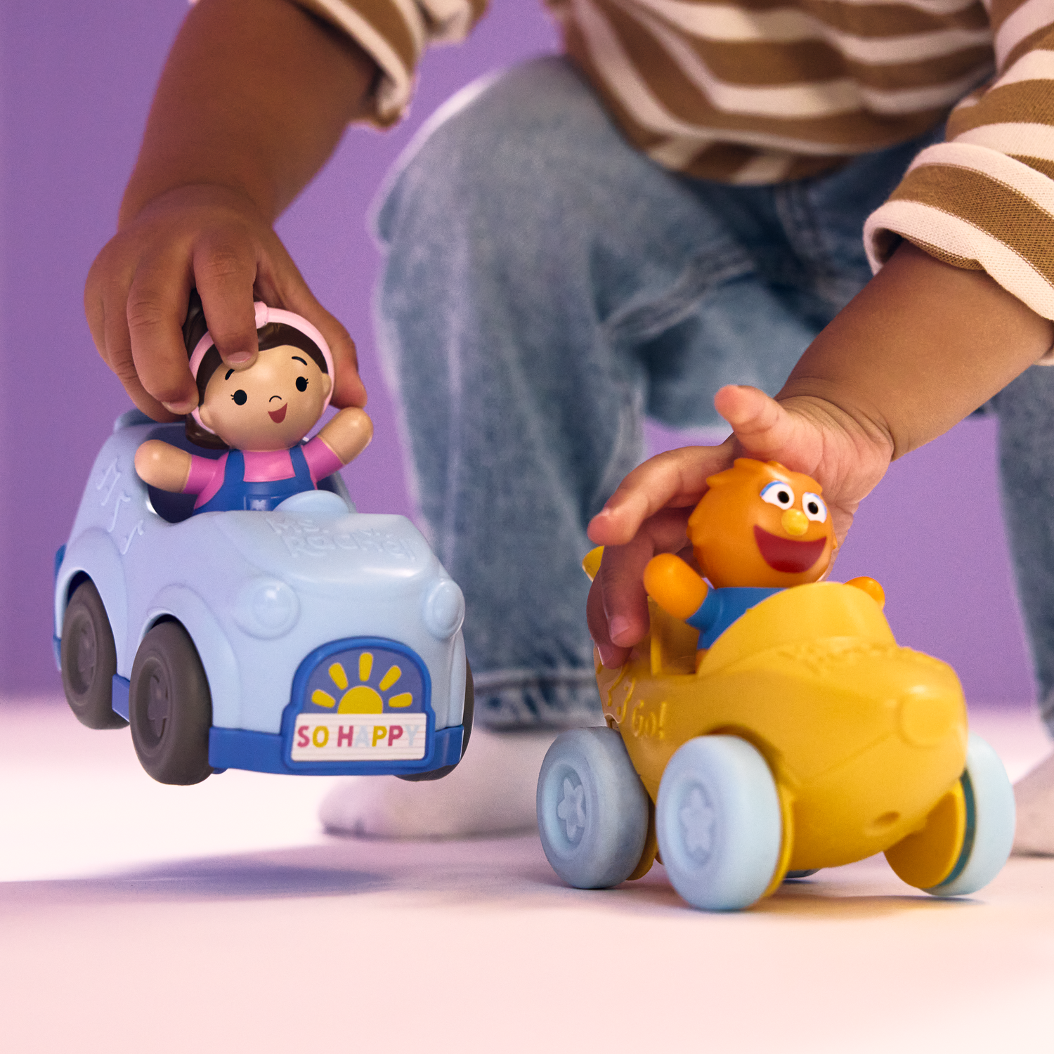 Littles strengthen motor skills as they grasp, pull back, and release Ms. Rachel’s car, turning playtime into an active learning moment.