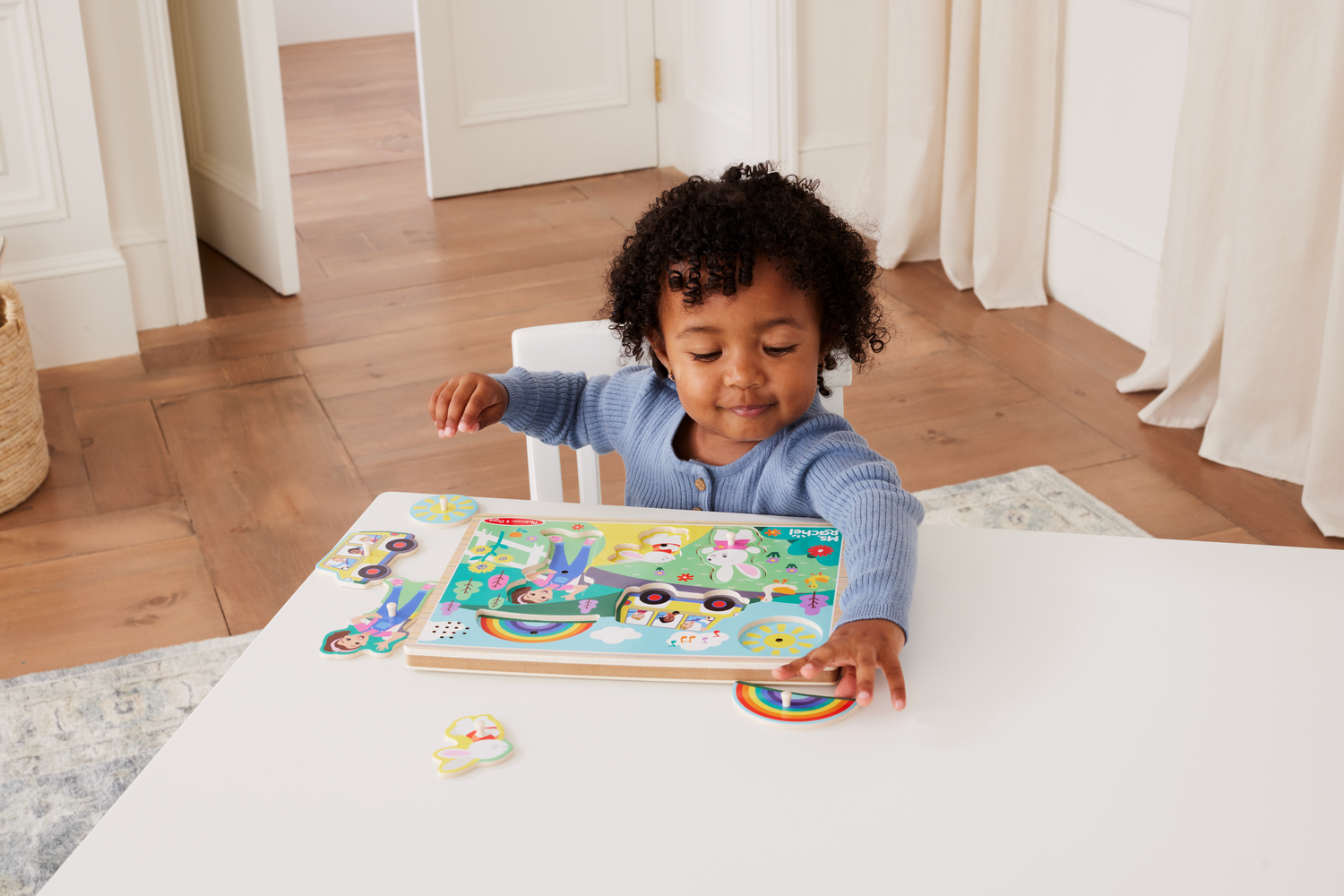 A Melissa & Doug exclusive! Sing along to six of Ms. Rachel’s most popular songs as your child matches each beautifully crafted puzzle piece to its spot on the board.